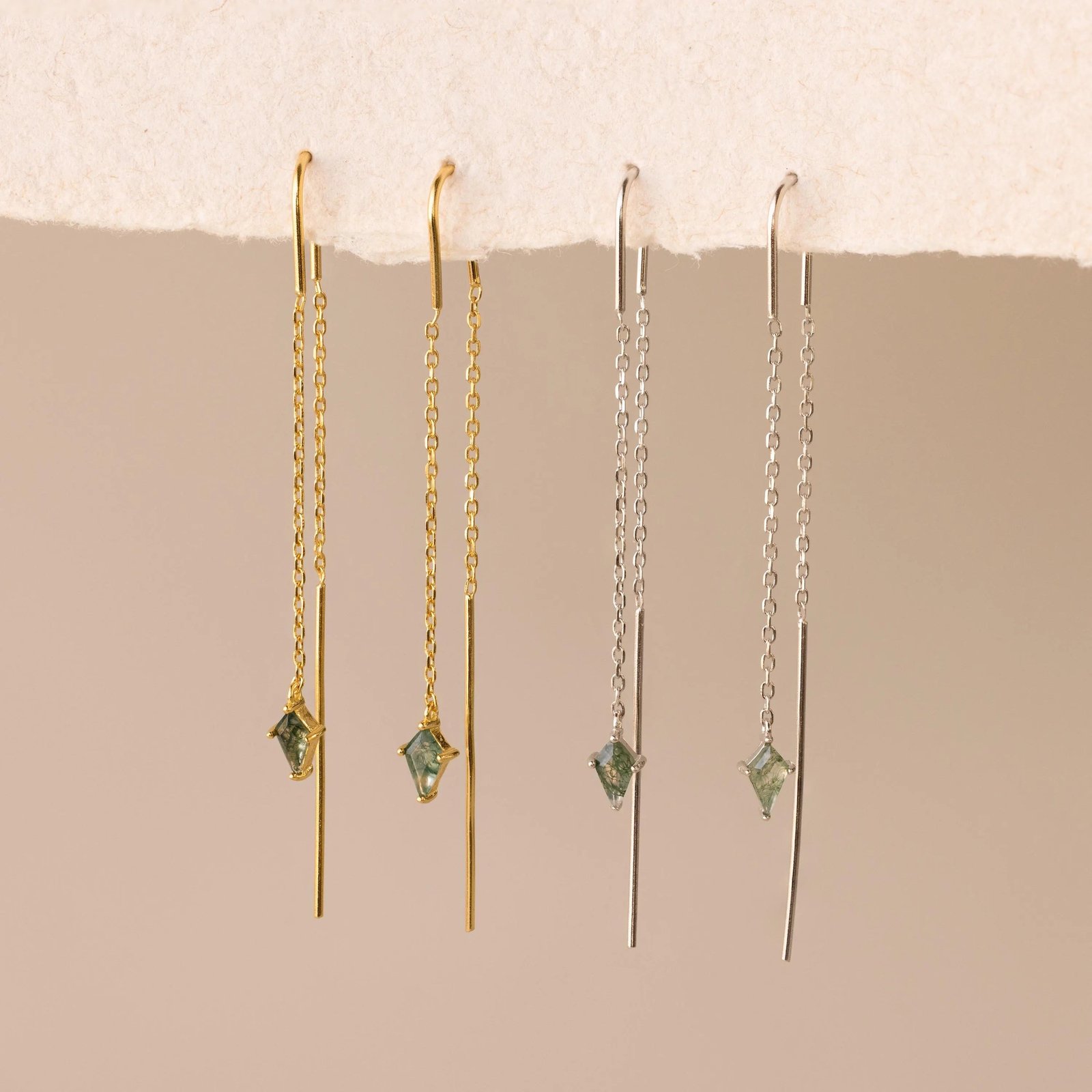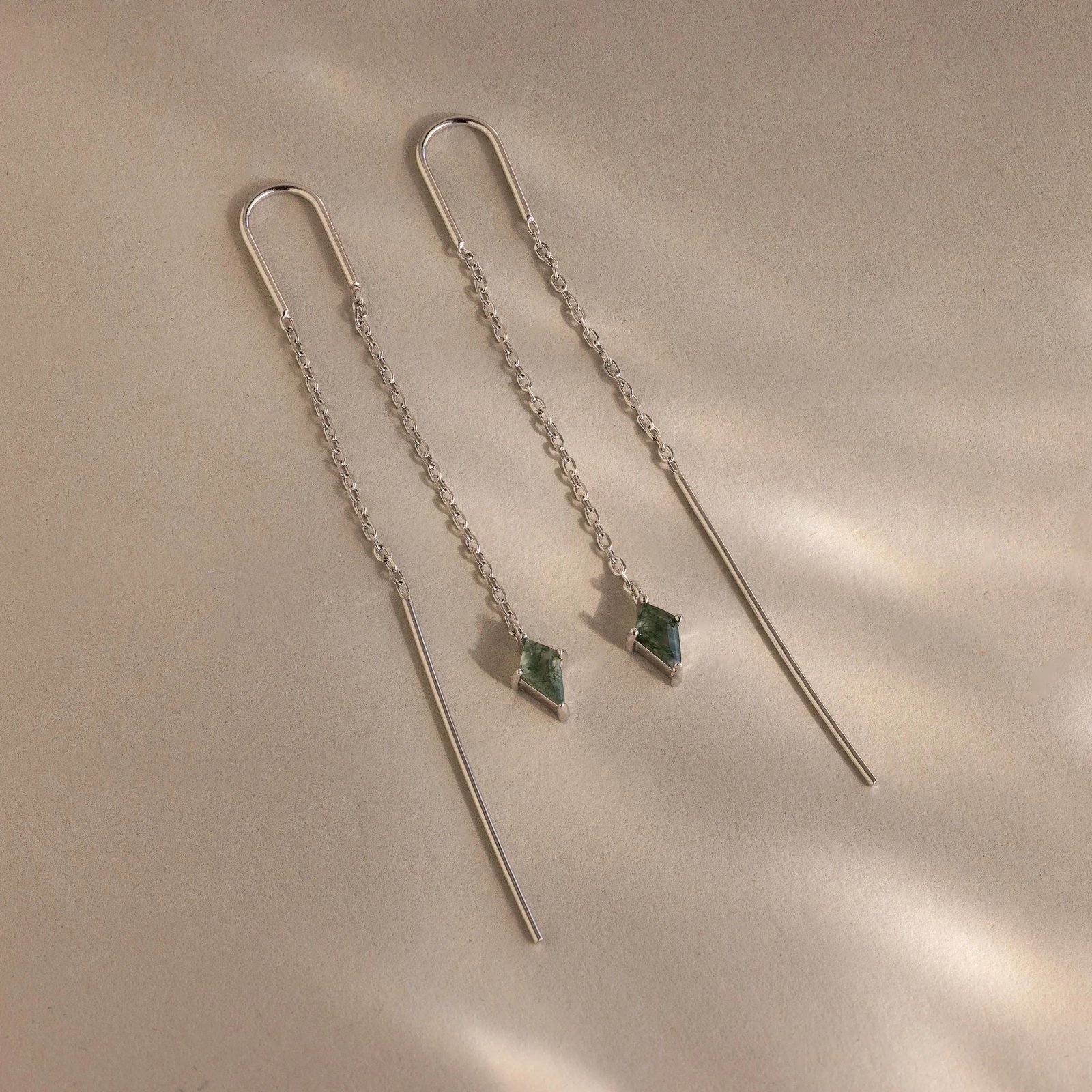 Add a touch of earthy sophistication to your look with our Agate Threader Earrings. Featuring mesmerizing moss agate stones suspended from sleek threader chains, these earrings effortlessly blend nature’s beauty with a chic, modern twist.