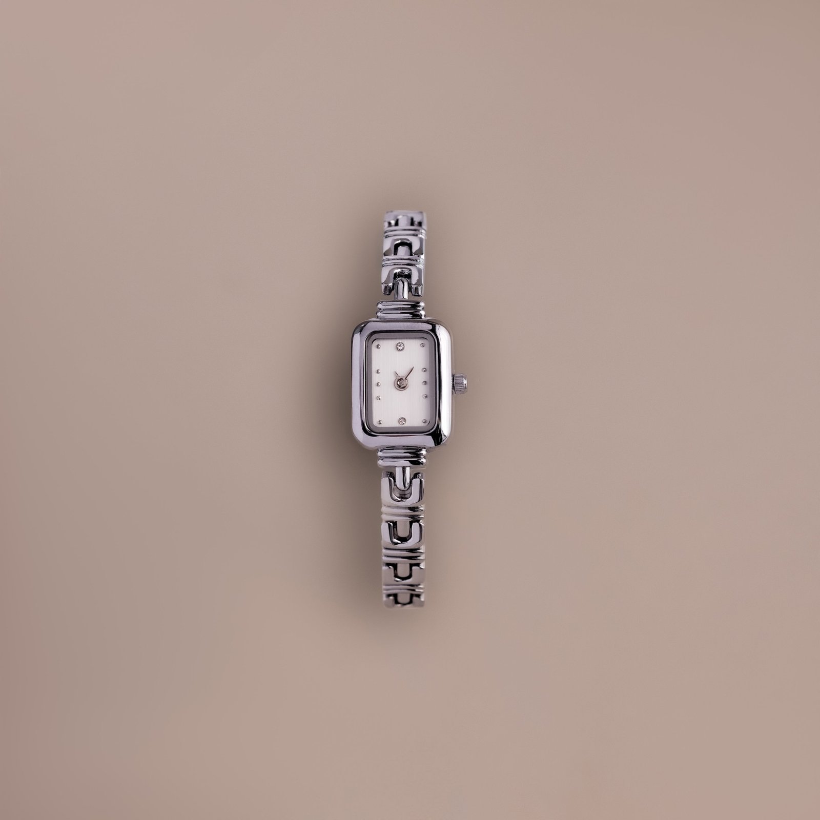 A bold yet refined statement, our Azteca Link Timepiece pairs a rectangular case with an intricate interlocking bracelet. Its minimalist champagne dial with crystal markers adds a touch of elegance, making it a timeless piece with modern edge.