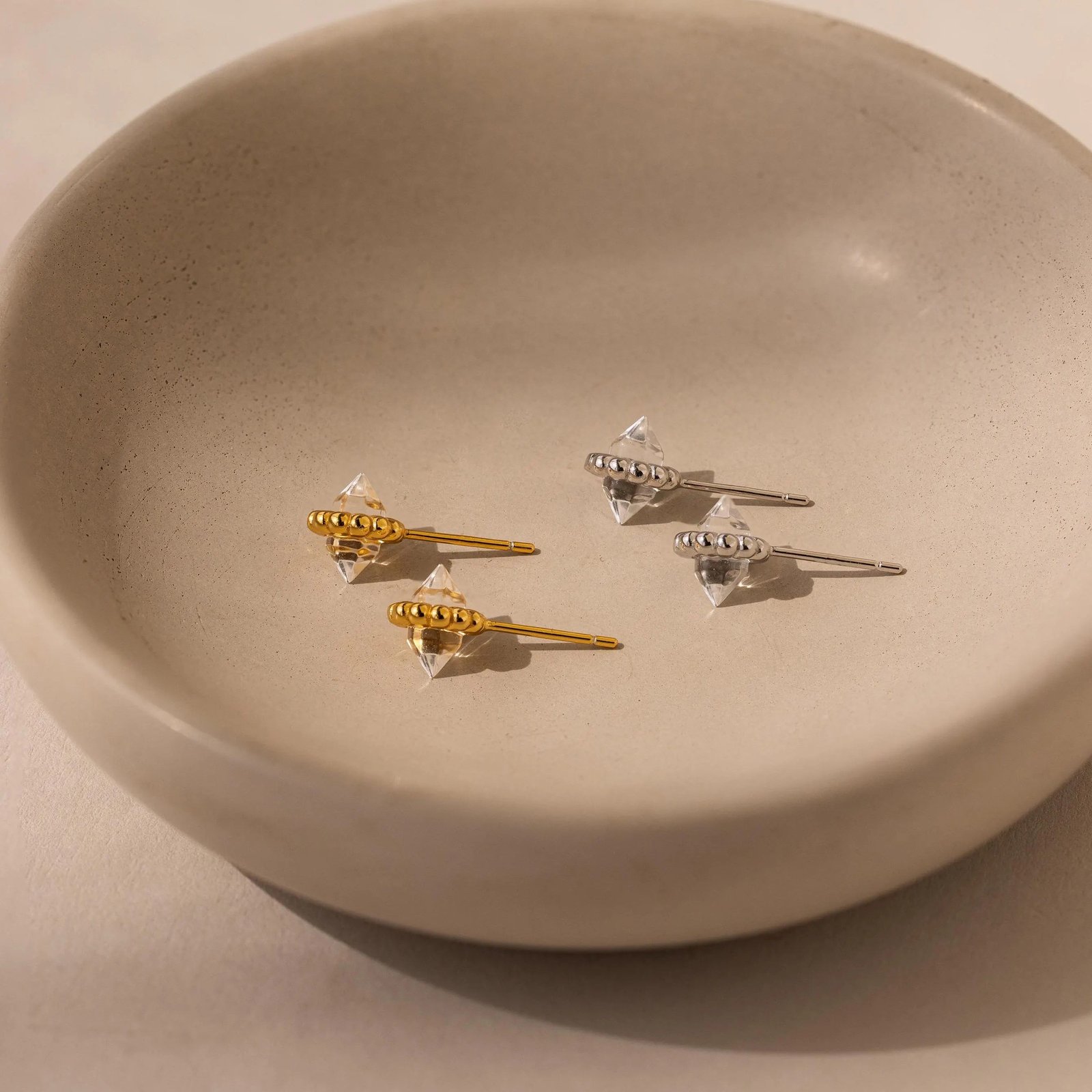 Like a little halo of light, our Beaded Herkimer Studs glow with an ethereal radiance. A Herkimer stone sits at the center, encircled by delicate beads that catch the light like tiny stars. Subtle, luminous and magical.
