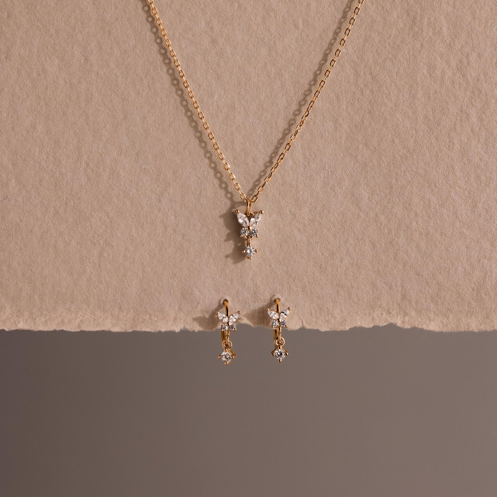 Our Diamond Butterfly Necklace & Earrings Set embodies delicate beauty and cute charm. Featuring a sparkling butterfly drop necklace and matching huggie earrings, each piece shimmers with graceful movement and diamond brilliance. A perfect gift for a bridesmaid or sister, it symbolizes transformation, love, and the special bond you share ♡