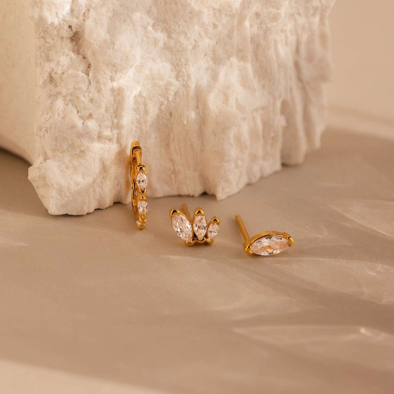 Introducing our Marquise Diamond Earrings Set: a stunning trio comprising a classic Marquise Stud, a dazzling Triple Marquise Floral Stud, and an elegant Triple Marquise Hoop Earring. Designed to enhance wedding elegance and ideal as bridesmaid gifts, this set exudes timeless beauty and sophistication, adding an extra sparkle to your special day.